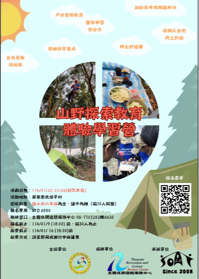 說明: 一、課程目的:透過與大自然親密接觸與對話達到自我探索與 成長及透過戶外冒險教育課程導入培育未來領袖特質。 二、課程效益:遠離舒適圈作中學、自我察覺與挑戰、團隊學 習與合作、創新思考與問題解決等能力。 三、主辦單位:國立屏東科技大學 休閒運動健康系。 四、協辦單位:國立屏東科技大學 主題休閒遊憩服務中心。 五、承辦單位:南方戶外冒險團隊 SOAT 2.0。 六、課程時間:114年1月23日至1月26日(週四~週日),4天3 夜。 七、課程地點:屏東縣泰武鄉 (泰武部落山區)。 八、招生對象:國小5-6 年級生至為主,國中7年為輔,預計招收人數 30 人,依報名繳費確認順序為最後錄取名單 (20 人確定開團)。 九、報名費用:每人6,500元。 十、線上報名系統:請連結以下報名路徑 https://forms.gle /ceBqVa3yTbkCbDb6A 十一、詢問專線:主題休閒遊憩服務中心。 (一)聯絡人:活動組。 (二)電話:08-7703202轉6630。 (三)電子郵件:trlsc2009@gmail.com。 十二、報名截止日:114年01月09日(18:00)前。 十三、繳費截止日:114年01月16日(18:00)前完成繳費及雙方 確認。 十四、繳費方式:請至郵局或銀行申辦匯票。(收款人:國立屏 東科技大學,匯款人請填寫與聯絡人相同的姓名,方便 核對資料)。 十五、檢附實施計畫書、海報各1份