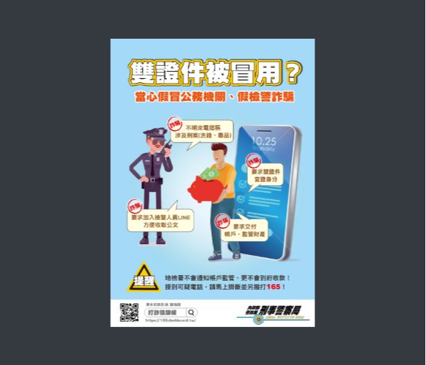 主旨:為強化識詐宣導跨局處橫向合作及有效推動識詐工作,請 貴校協助運用所屬網站平臺發布防詐資訊並加強推播打詐 儀錶板網頁連結,請查照。