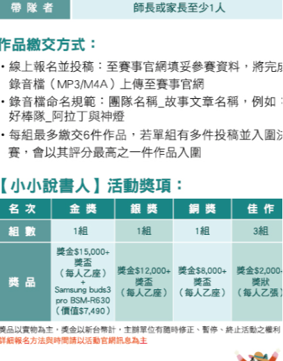 (二)小小說書人:國小1-6年級學生,每隊2-6人(含帶隊 者),帶隊師長或家長至少1人。 (三)專業創作組:年齡滿15歲以上,每隊1-2人(隊長需滿18 歲)在校學生或社會人士均可參賽。 三 、為鼓勵師生及家長參與我國毒品防制政策推動,「反毒創 作組」入圍決賽隊伍,頒發教育部團體獎狀乙禎。