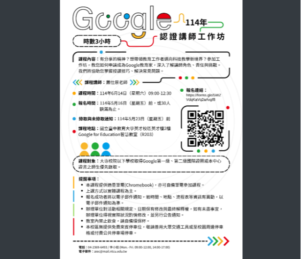 主旨:檢送國立臺中教育大學智慧教育中心辦理「114年Google 認證講師工作坊」訊息,請轉知所屬踴躍報名參加,並惠 予所屬各錄取人員公(差)假,請查照。
