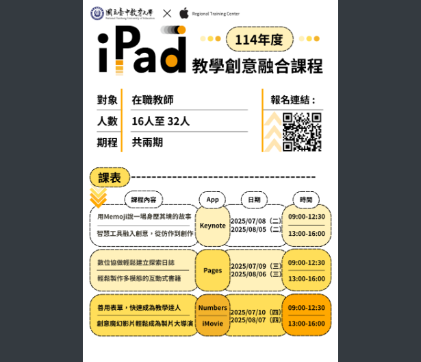 (一)114年度iPad教學創意融合課程(第一期),課程時間為 114年7月8日(星期二)至114年7月10日(星期四)上午 9時至下午4時。