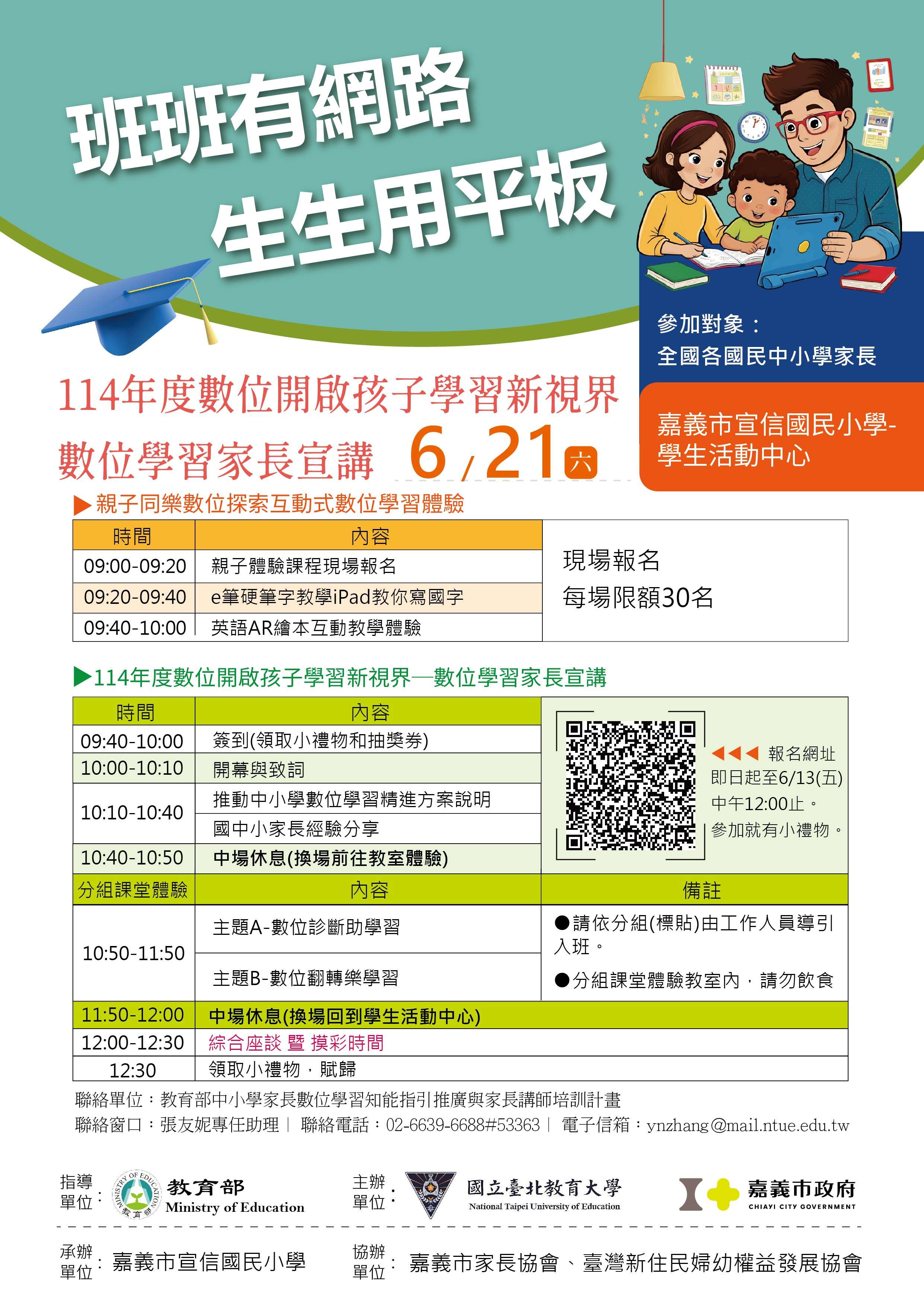 二、活動名稱:114年度數位開啟孩子學習新視界─數位學習家 長宣講。