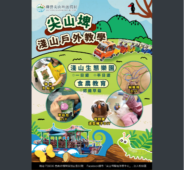 說明: 一、本渡假村位於臺南市柳營區,距國道三號柳營交流道出口 約5分鐘車程,為取得環境教育設施場所認證之場域,並同 時具備環保旅館與綠色餐廳資格,提供住宿、餐飲、會 議、休閒及環境教育學習等多元服務。 二、本渡假村設有「尖山埤環境學習中心」,並於110年榮獲環 境教育設施場所評鑑「優異單位」之肯定。為推動環境教 育結合戶外學習,規劃有適合國中小及幼童的戶外教學方 案(詳附件),以尖山埤淺山生態環境為主軸,結合多元 且具童趣之DIY體驗活動,以及規劃有在地草菇社區導覽行 程,帶領學生認識鄉土文化與自然環境,強化生活與學習 之連結。 三、活動採預約制,可依貴校教學需求彈性調整與客製化規 劃。另本渡假村亦提供住宿、餐飲(合菜或環保餐盒)、 露營、烤肉及水域活動(如獨木舟體驗)等相關服務,期 能為學校戶外教育提供完善配套與優質體驗。 四、如有參訪或活動安排需求,歡迎洽詢本渡假村,聯絡電 話:(06)623-3888 分機4000。活動資訊亦可參閱「尖山埤 環境學習中心」Facebook粉絲專頁及官網。