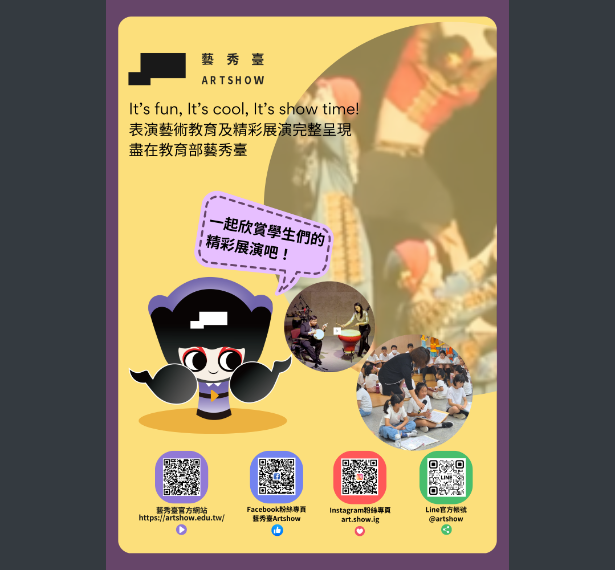 說明: 一、依據教育部114年9月23日臺教師(一)字第1140100160號函 辦理。 二、「藝秀臺」徵集全國各級學校表演藝術影音作品並提供相 關延伸學習內容,涵蓋音樂、舞蹈、創意戲劇、鄉土歌謠 四大類,自111年開臺迄今收錄550部豐富多元之影音內 容,可供師生及大眾上線欣賞演出,並以表演藝術為核心 擴展,提供各類藝術成果作為延伸教學應用。 三、「藝秀臺」114年9月最新上線影片為: (一)113學年度全國音樂學生比賽團體項目「行進管樂」北 區、中區及南區決賽紀錄共31支影片。 (二)《藝師藝有》113學年度線上成果展,共6支影片。四、「藝秀臺」將持續提供優質展演及表演藝術教育推廣內 容,更多精采影片,請至「藝秀臺」網站,或至「藝秀 臺」臉書粉絲專頁:臉書搜尋「藝秀臺ArtShow」、官方 IG:搜尋「art.show.ig」關注即時訊息。 五、藝秀臺網站連結圖檔及最新上線影片名單如附件,歡迎多 加推廣運用;如有相關疑義,請洽教育部承辦人陳小姐 (02)7736-6227或國立臺灣藝術大學表演藝術學院張小姐: (02)2272-2181分機2597。